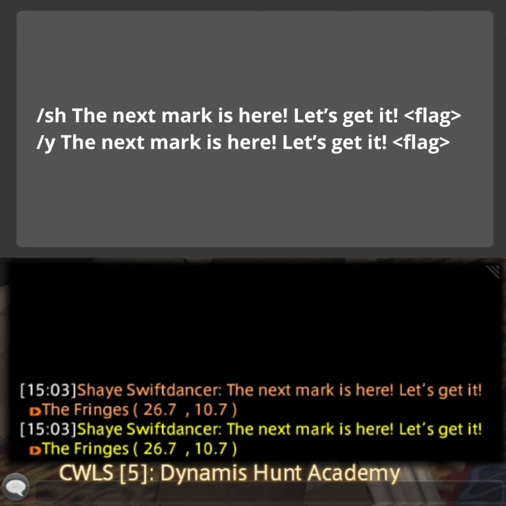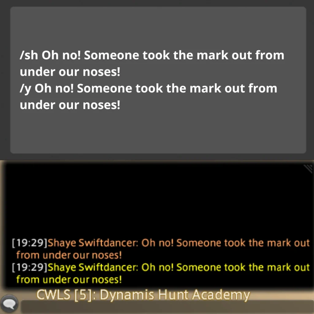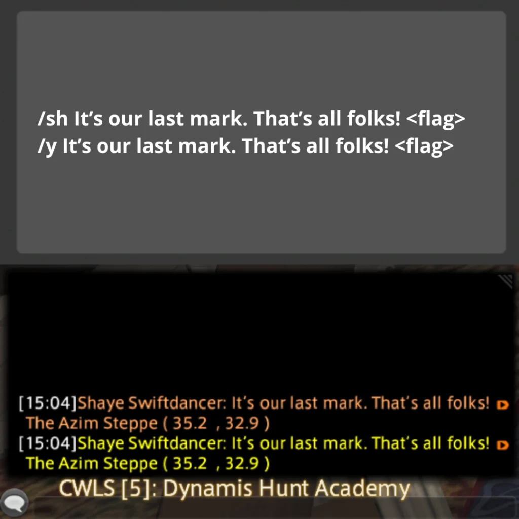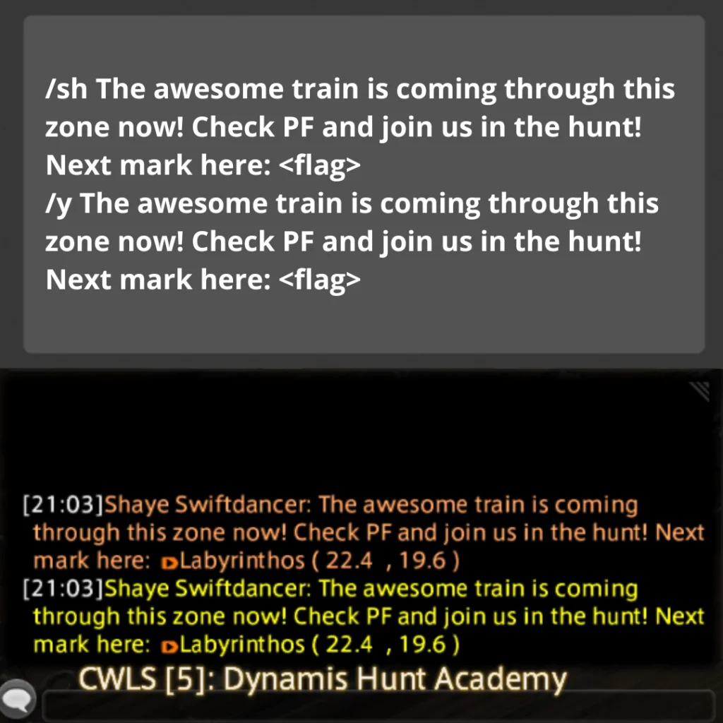 Echo chat is a feature within the game that allows you to input or view text exclusively visible to yourself; it does not appear in any public chat channels. This feature proves useful for setting up hunt flags in Echo chat, creating what we commonly refer to as an “Echo Log,” which serves as a handy reference tool while conducting hunts. *Please note that your echo log will get overwritten by too many system messages (since you cannot disable them) if you are hopping worlds a lot between when you place your flags and when you run your train, so be cautious!