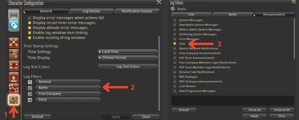 2. Head to Character Configuration —> Log Window Settings.