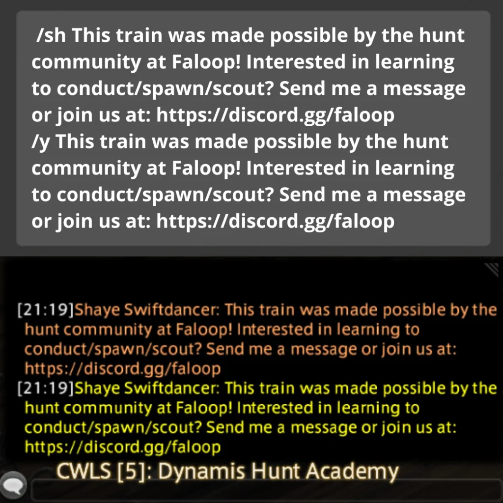 This is gonna reach people who are not in the Faloop community and also don’t have a Hunt Linkshell to get the information from, and it’s gonna draw more attendees into your trains.