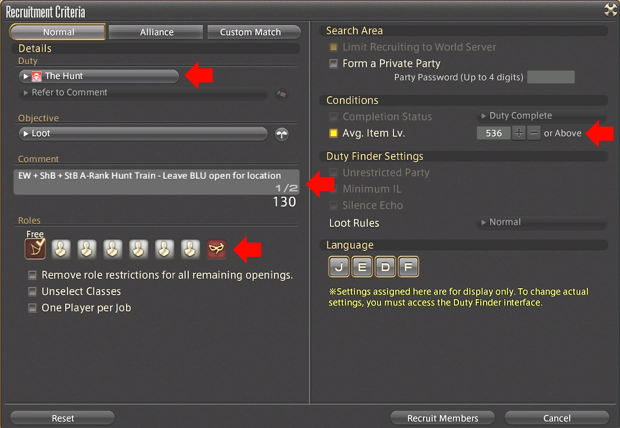 The “Duty” will be “The Hunt”, you can put an “Objective” of whatever you’d like or leave it blank, and then describe your train in the comments section. You may also mention that you are leaving one spot open (typically Blue Mage since you can easily item level lock them out) to keep your party finder up for the duration of the train so people can see your current location.