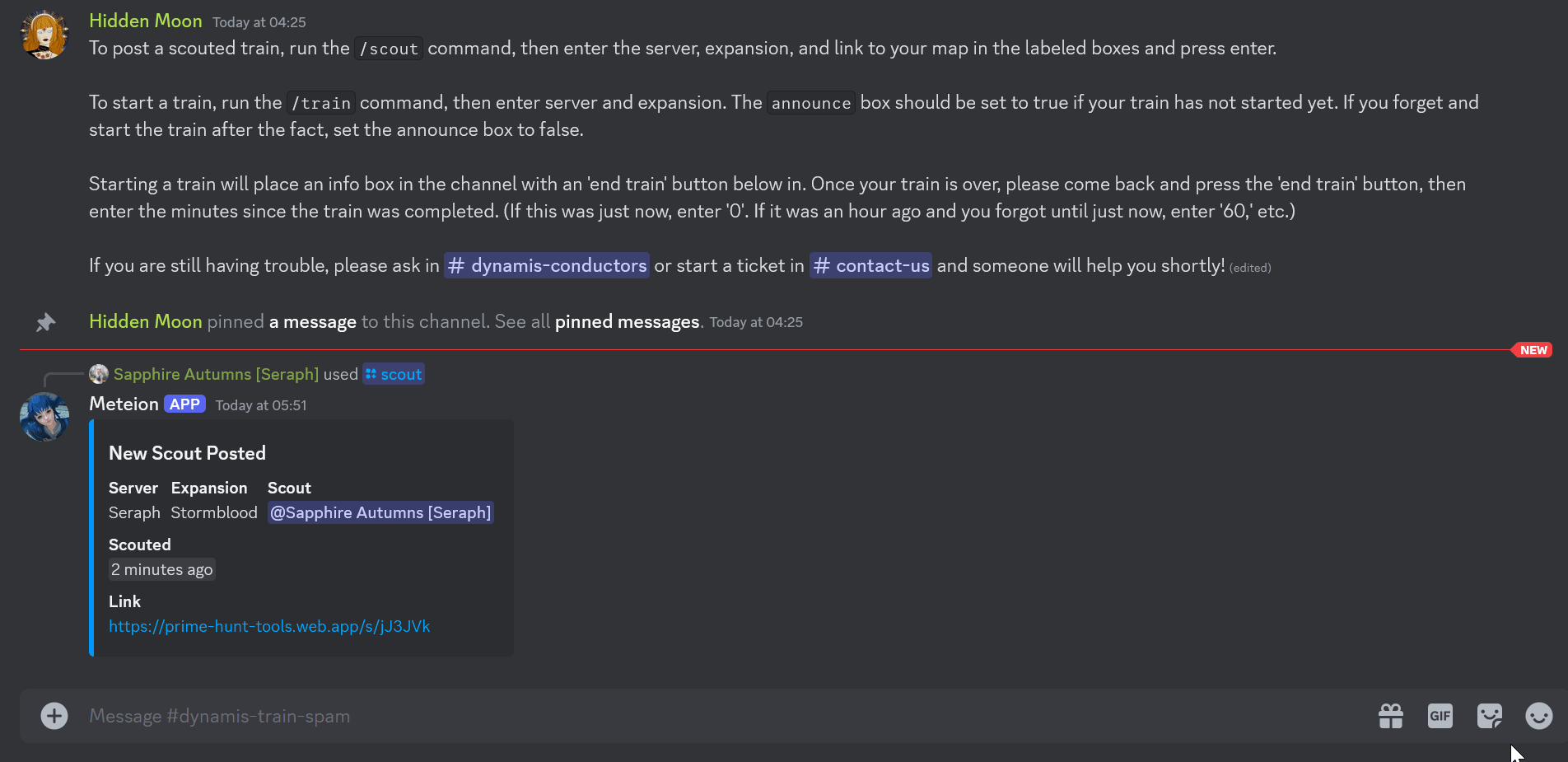The Train Spam channel (dynamis-train-spam) has a bot named Meteion that is utilized to post scouts and to start and end trains. The information posted to the bot via the commands /train and /scout gets published to the Train Board and provides the status updates displayed there. You can also use the /trackinfo command to get information on the last train and scout for a particular world/expansion.