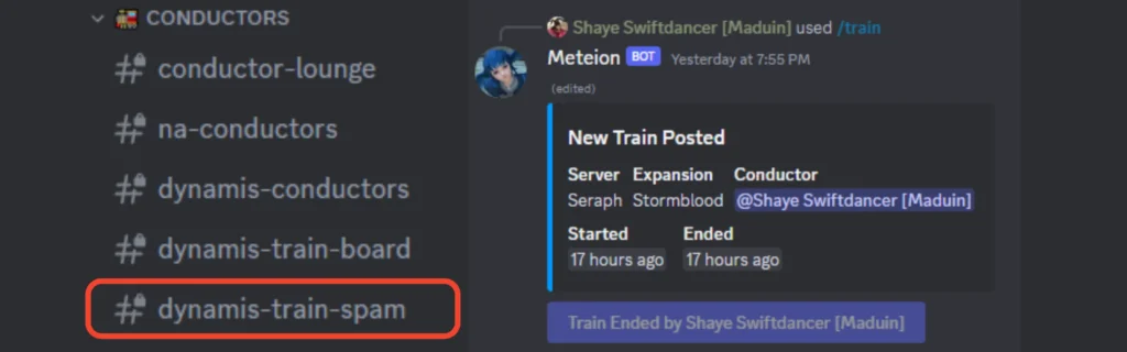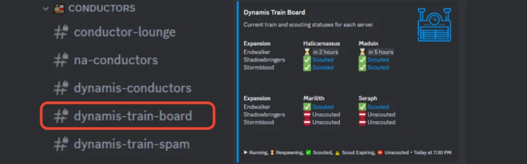 The Train Spam channel (dynamis-train-spam) has a bot named Meteion that is utilized to post scouts and to start and end trains. The information posted to the bot via the commands /train and /scout gets published to the Train Board and provides the status updates displayed there. You can also use the /trackinfo command to get information on the last train and scout for a particular world/expansion.