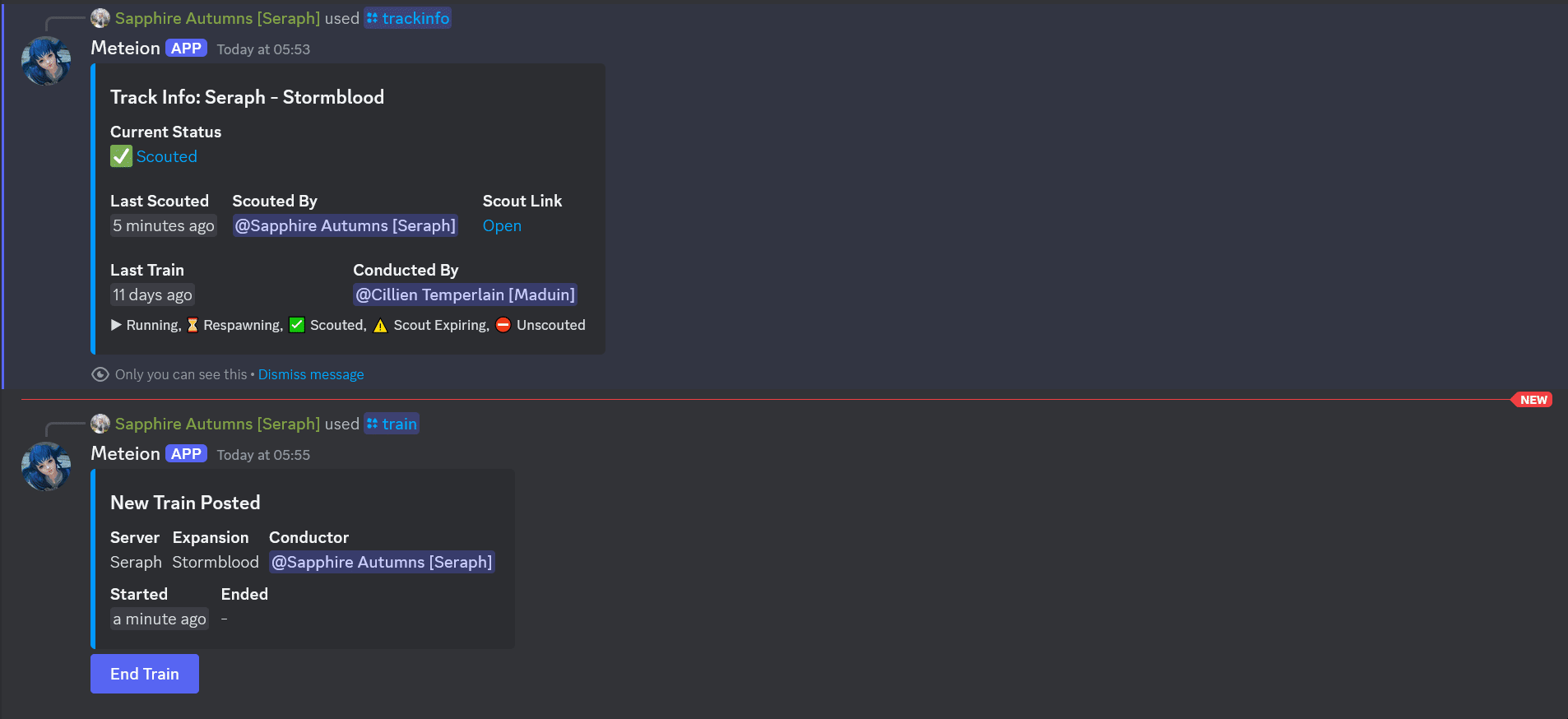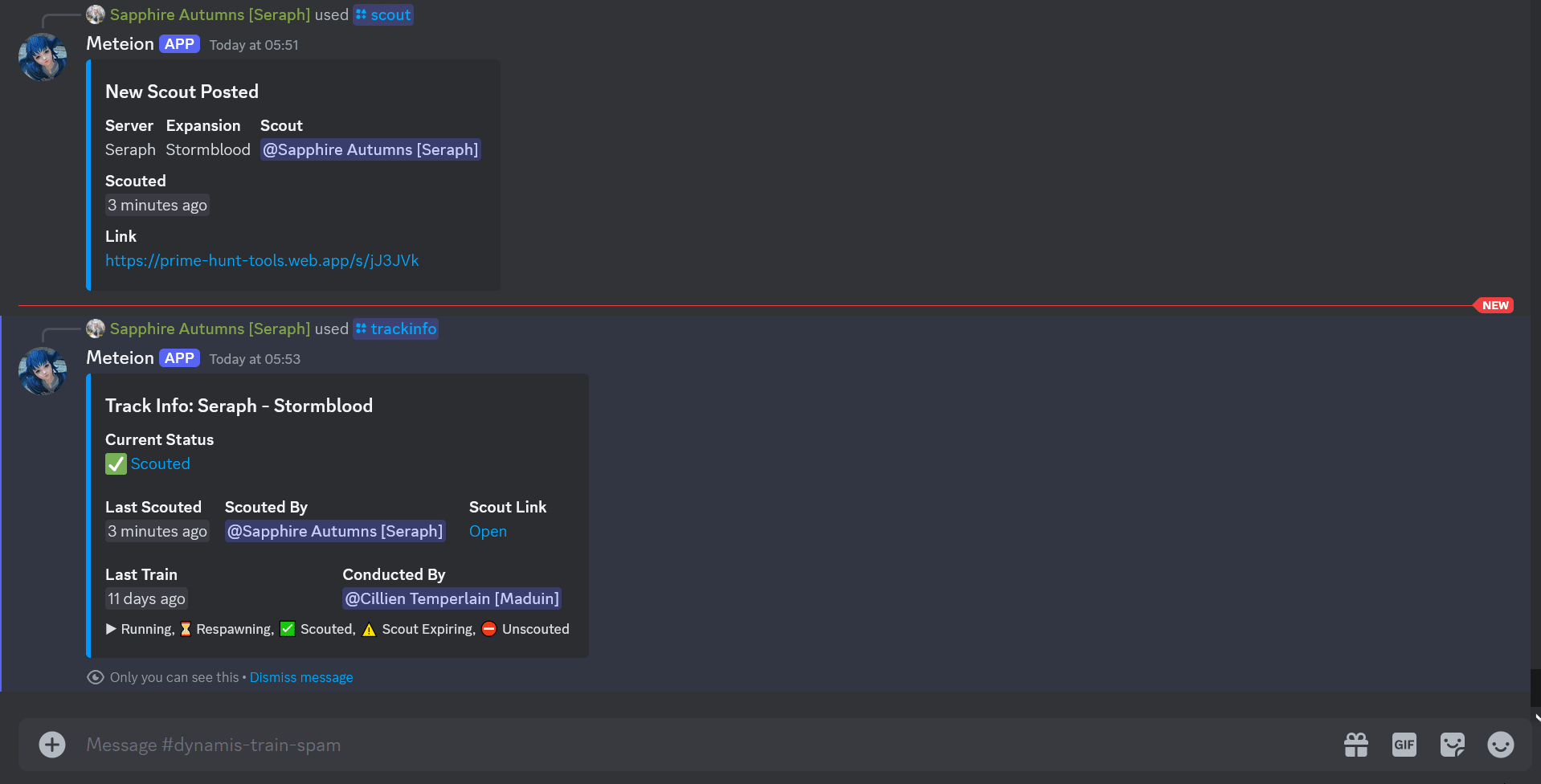 The Train Spam channel (dynamis-train-spam) has a bot named Meteion that is utilized to post scouts and to start and end trains. The information posted to the bot via the commands /train and /scout gets published to the Train Board and provides the status updates displayed there. You can also use the /trackinfo command to get information on the last train and scout for a particular world/expansion.