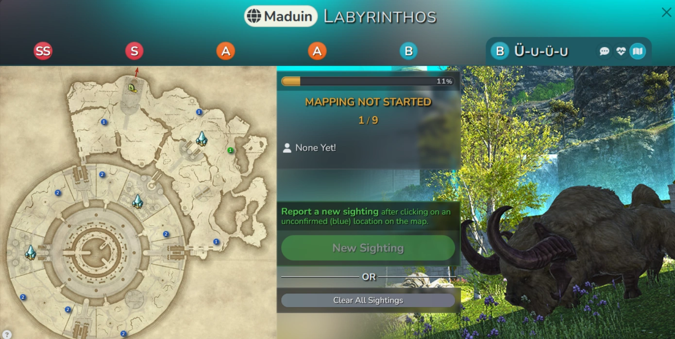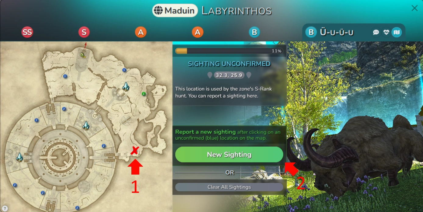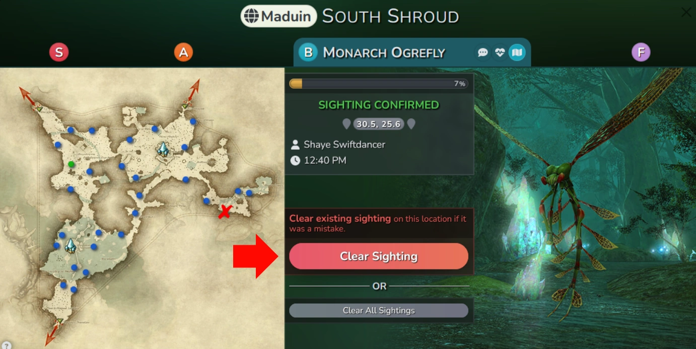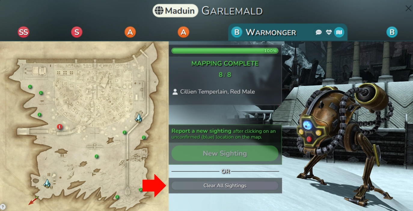 If a zone has been fully mapped, but you notice that a A or B Rank mark has taken the expected spot of the S-Rank, the mapping was done incorrectly. At that point, it is best to clear the entire map of sightings and start fresh. There is a grey colored button across the bottom reading “Clear All Sightings” that will do this.