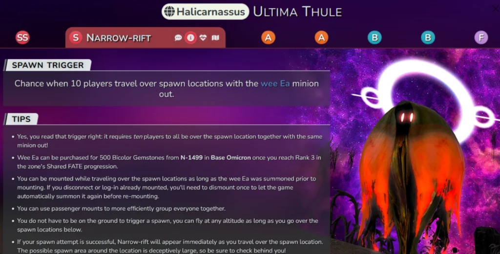 There are a few “categories” or “types” of spawns. Some examples are: gathering spawns (where you have to catch a special fish or gather materials to have a chance at spawn), “landmine” spawns (where you have to perform an action or have a certain minion out directly on the spawn coordinates), kill counts or “KCs” (where you have to kill a certain number of mobs to get a spawn), weather condition spawns (only spawn when the weather in-game is right), discard spawns (where you have to discard certain items from your inventory for a spawn) and treasure map spawns. Some S-Ranks require you to die or almost die as well. There are lots of variations to this, and that’s part of the fun!