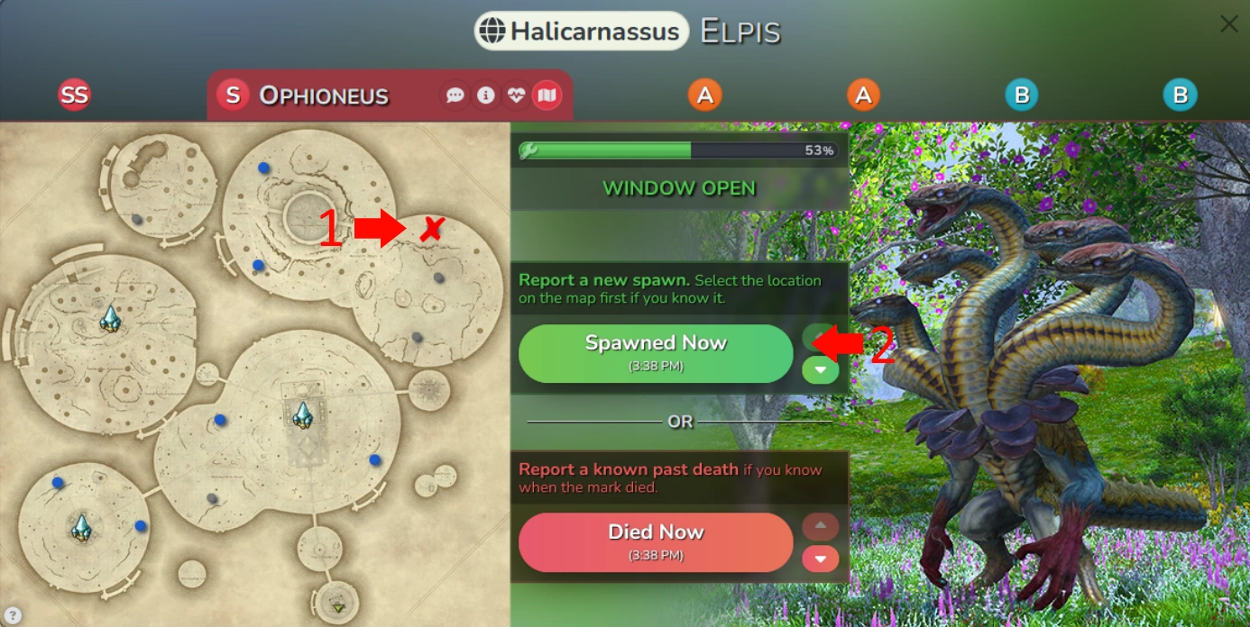 Back on the Faloop site, on the page for your spawn, click the dot for the coordinates where you found the mark so the big red X appears there and then click “Spawned Now”. That’s when you’ll be presented with the option to either release it immediately, or schedule it for a manual release. Choose accordingly. If you are doing a manual release, keep an eye on the Discord and when the mark ahead of yours is killed, then you may release yours.