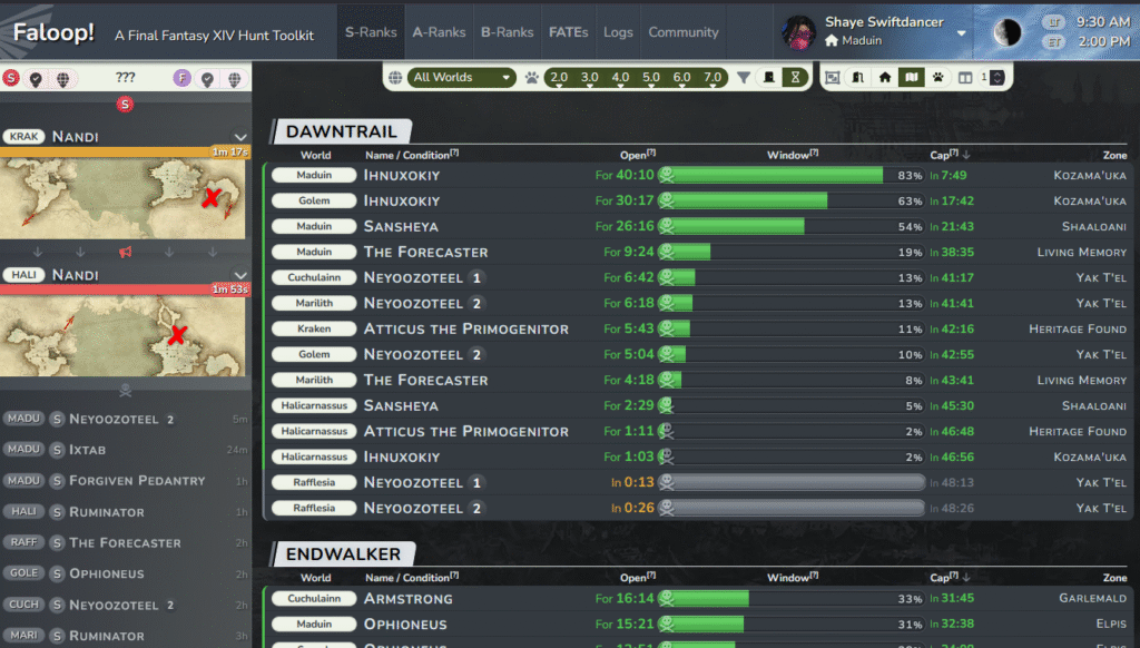 - Unlike for conducting, with S-Rank spawning, you probably don’t want to wait until the marks have reached cap to attempt to spawn them. Many marks will spawn prior to cap, so if you aren’t trying prior to cap, other spawners will beat you to it! Basically, as long as the window is open (green or blue), you should give it a shot. For the complicated ones, like the kill-count spawns, you may want to wait until the window percentage is fairly close to cap, but if you don’t mind killing hundreds of mobs and not getting a spawn, by all means, go for it!